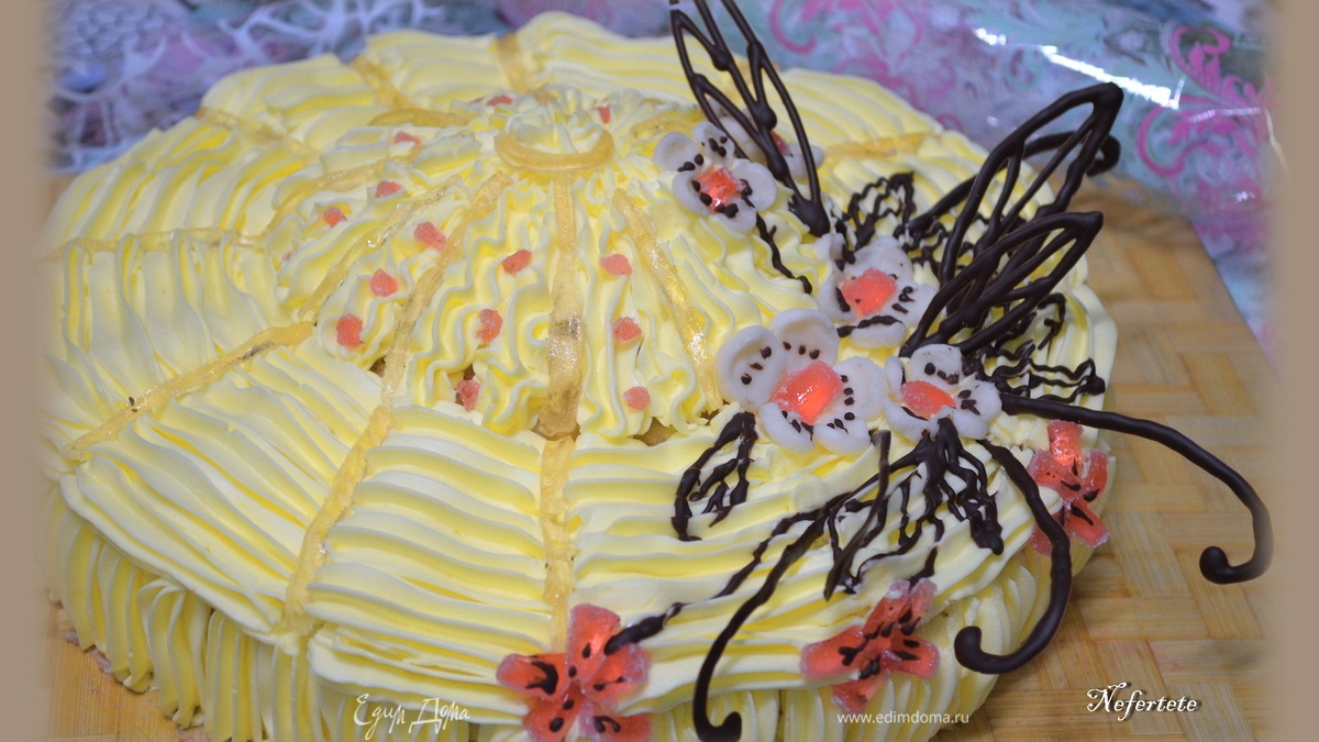 Этот торт из бисквитного теста со сливочным кремом. Можно исполнить сей торт и со сметанным кремом, но украсить верх только сливочным кремом. Вес торта получается 2 кг. Целесообразно его готовить для большого количества гостей. Желаю успехов!