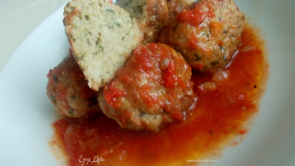 Отдельно тушим луковицу в сливочном масле до мягкости и вливаем томат или томатный сок. Доводим до кипения, солим и перчим. Отправляем наши тефтельки в соус и тушим под крышкой еще минут 10. - Шаг 4