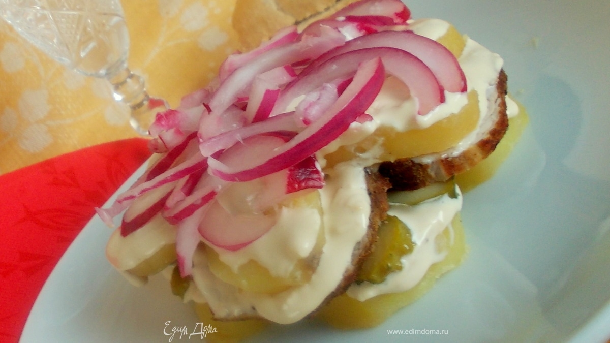 На тарелку выкладываем кольцами порезанный картофель, который мы предварительно сварили в мундире. Поливаем заправкой. - Шаг 5