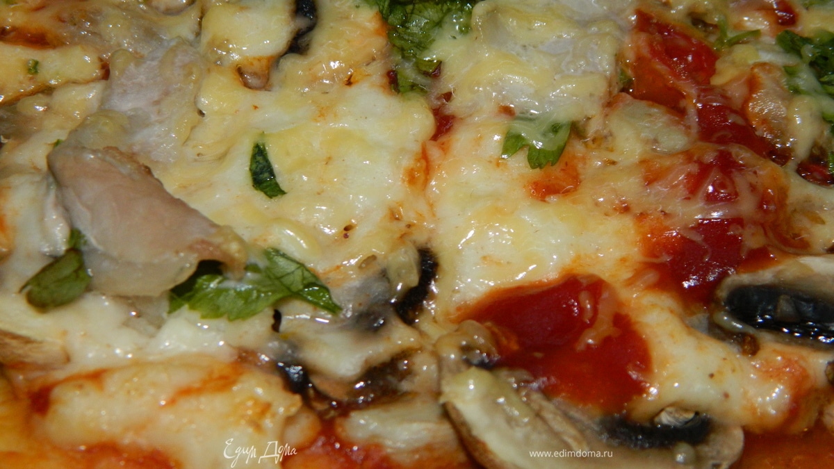 - Шаг 6Пекла в электрической духовке в режиме «Пицца» или «Нижний тен+горячий обдув». Температура 200°С, время — 20 минут. Тесто для пиццы получается тонким как в пиццерии.