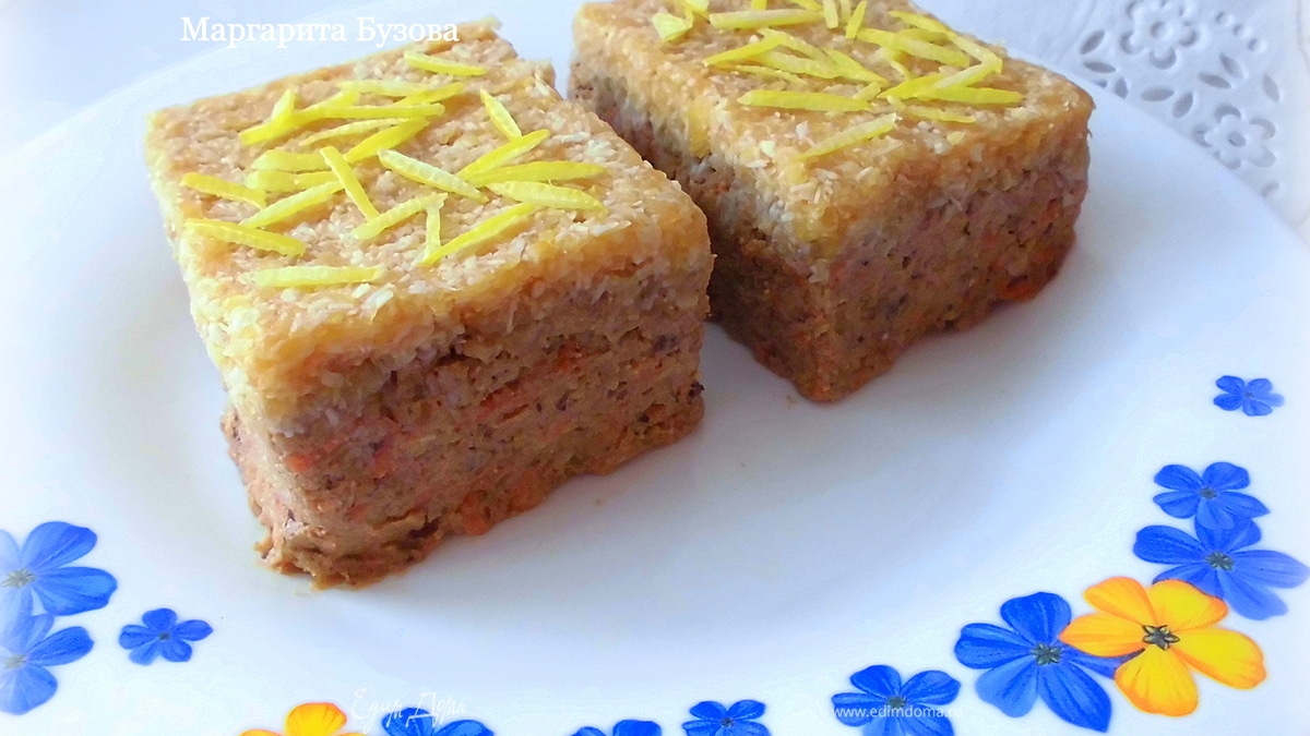 Для верхнего слоя: яблоки очистить от сердцевины и натереть их на мелкой терке. Добавить немного лимонного сока, натертую цедру 1 лимона, кокосовую стружку и мёд. Тщательно перемешать. Выложить полученную смесь на готовую основу и убрать в холодильник хотя бы на 1 час. Затем нарезать и подавать. - Шаг 6