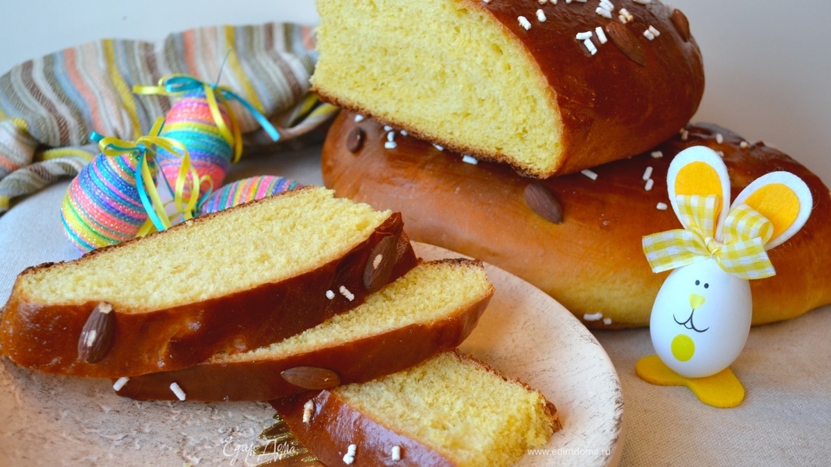 На самом деле "караваем" эту булку назвала я... Родом эта пасхальная выпечка из Триеста и называется Pinza Triestina. Традиционно этот сдобный хлеб едят на завтрак на Пасху, причем в некоторых местах подают его с итальянским "прошутто" (ветчиной)
