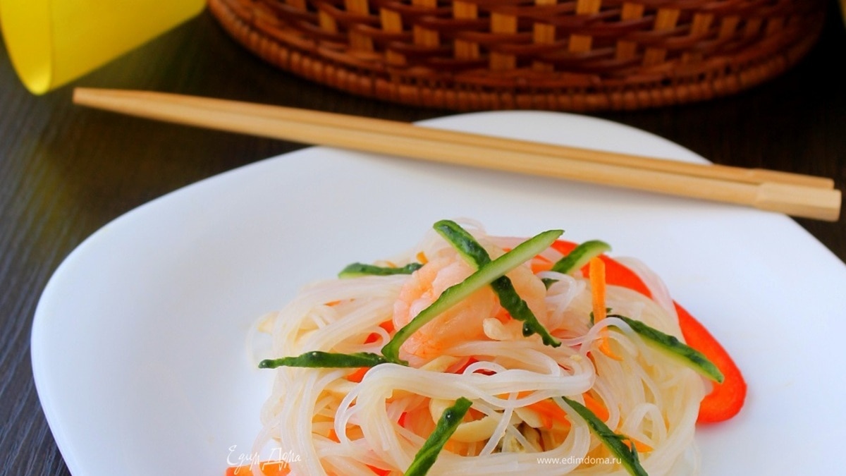 Фунчозу откинуть на дуршлаг, дать воде стечь и сложить в салатник, туда же добавить обжаренные овощи и морепродукты. Аккуратно все вместе перемешать. - Шаг 3