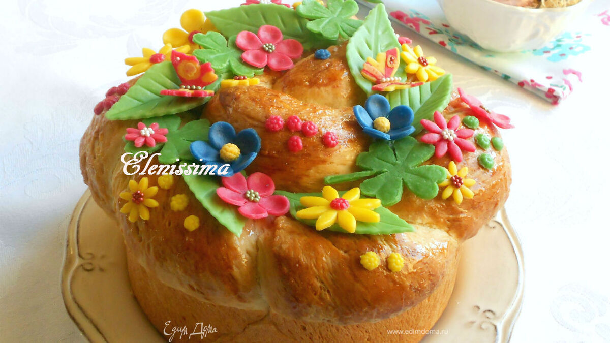 Давно мечтала испечь греческий пасхальный хлеб цуреки, который, обычно выпекается в форме плетёнки, но не смогла найти особые нужные пряности, а без них, говорят, цуреки не цуреки, так что буду мечтать дальше!)) Знаю, что и итальянцы пекут "косы" в виде венка и украшают яйцами, поэтому от идеи плетёнки мне никак не хотелось отказываться. Кроме того, придумалось украшение в виде цветочного венка вместо помадки. За основу взят рецепт из книги "Православная обрядовая кулинария", но с моими изменениями. Вот так и родился рецепт плетёного кулича, чем с вами и делюсь! Хотелось чего-то нового, необычного- думаю, что это удалось. Меня результат порадовал.