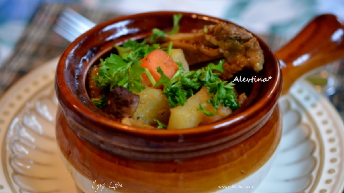 Вкусный ужин на двоих или на семью с кусочками мяса в горшочках. По рецепту идут говяжьи ребра с костью или без, разрезанные на кусочки.