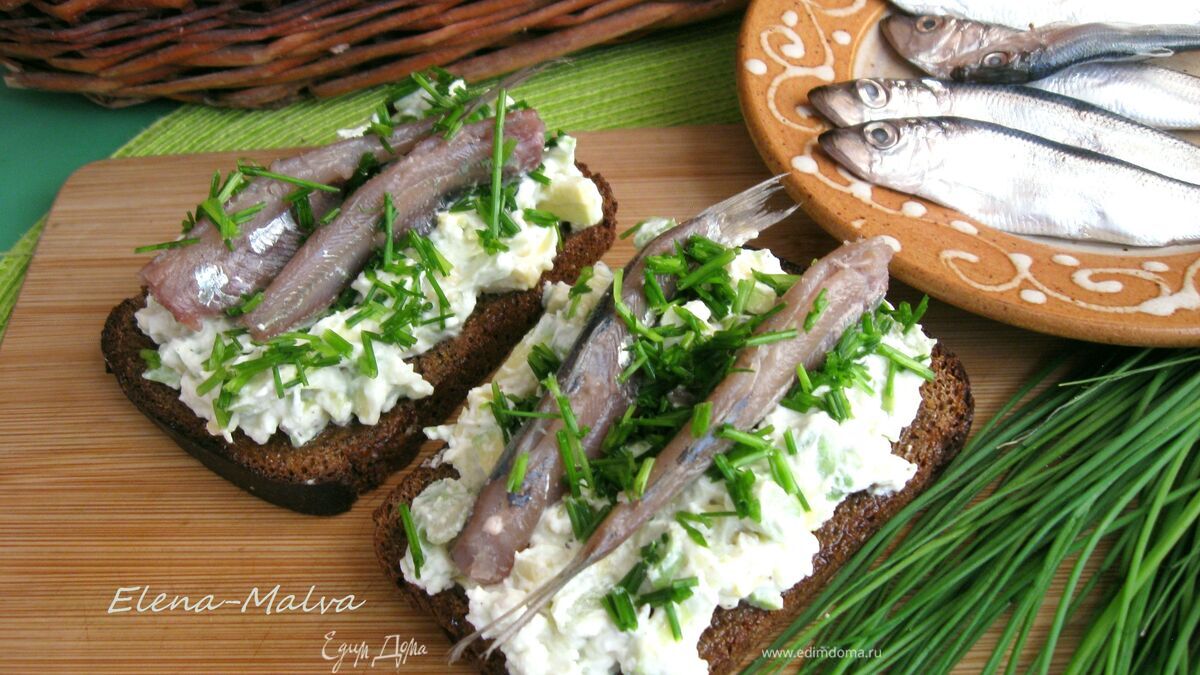 Нанести на хлеб смесь, обсыпать луком, сверху положить по 2 кильки. Приятного аппетита!