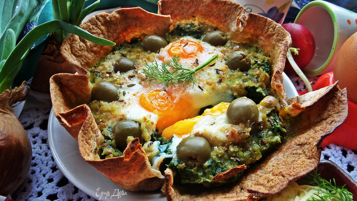 Глазунья, запечённая в шпинате
