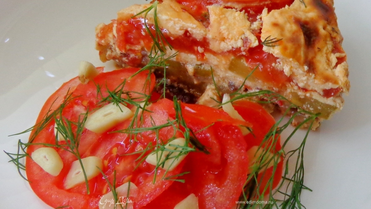 Сверху уложить нарезанные кружками помидоры и рубленый чеснок, посолить, поперчить. - Шаг 6