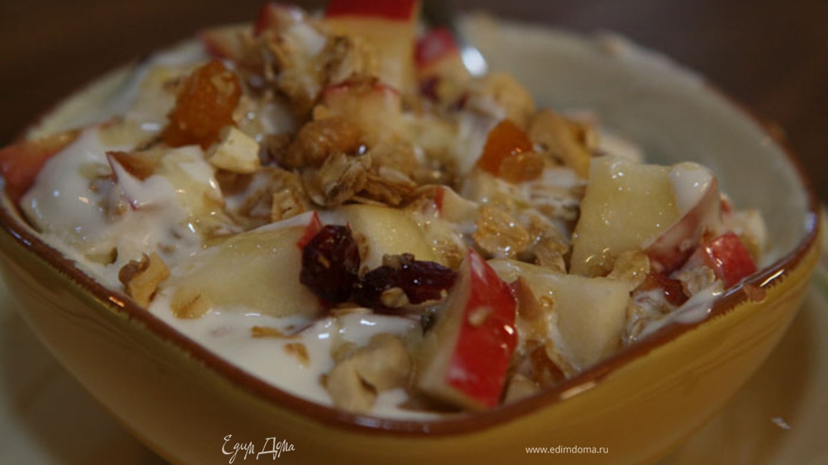 Разложить нарезанное яблоко в две креманки, добавить в каждую 4–5 ст. ложек гранолы и залить все йогуртом. Полить кленовым сиропом, медом или вареньем.
