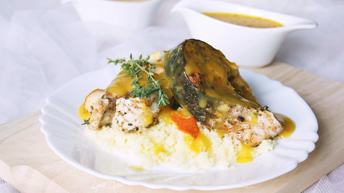 Пока кефаль готовится, займемся соусом. С одного апельсина натрем цедру. Выжмем сок из обоих. Смешаем сок апельсина, вино, мед и цедру. Ставим это все в небольшой кастрюльке на водяную баню (делаем это для того, чтобы температура не была большой и полезности меда сохранились по максимуму). Помешиваем и ждем растворения меда. После этого добавим крахмал и соль. Увариваем все, помешивая до легкой густоты. Затем закидываем корицу, мускат. Пробуем все. Если нужно, то добавляем чуть-чуть соли или сахара. Снимаем соус и оставляем дожидаться рыбы. - Шаг 2Гарнир можно приготовить любой - просто овощной салат, отварной рис, булгур. А у меня - кускус. Его я просто залила кипятком на 15 минут, помешивая изредка вилкой, чтобы не слипался. Выкладываем все красиво на тарелку и угощаем домашних, делая вид, что потратили на ужин кучу времени и сил, приготовив такую красоту. :) Приятного аппетита!