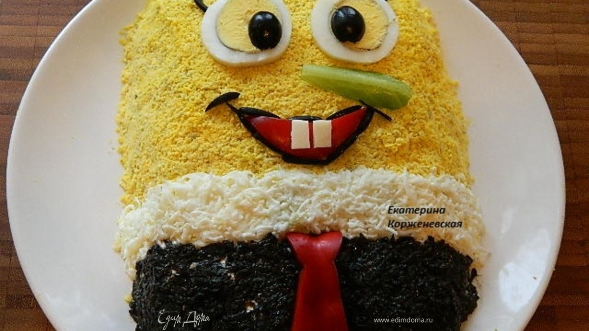 Сынуля очень любит этого героя:) Поэтому в голову пришла идея сделать салат в виде Спанч Боба на праздничный стол.