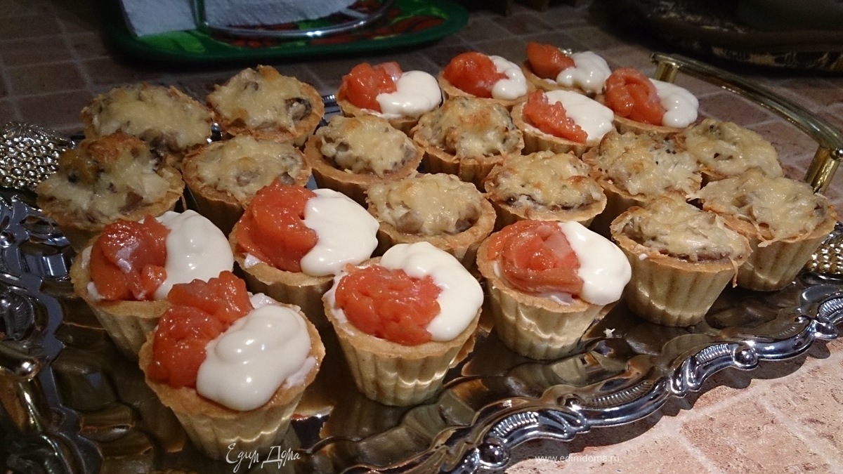 Семгу укладываем по два кусочка в виде розочки и с краю выдавливаем соус из кондитерского пакета. К столу можно подать на подносе с тарталетками с жульеном.