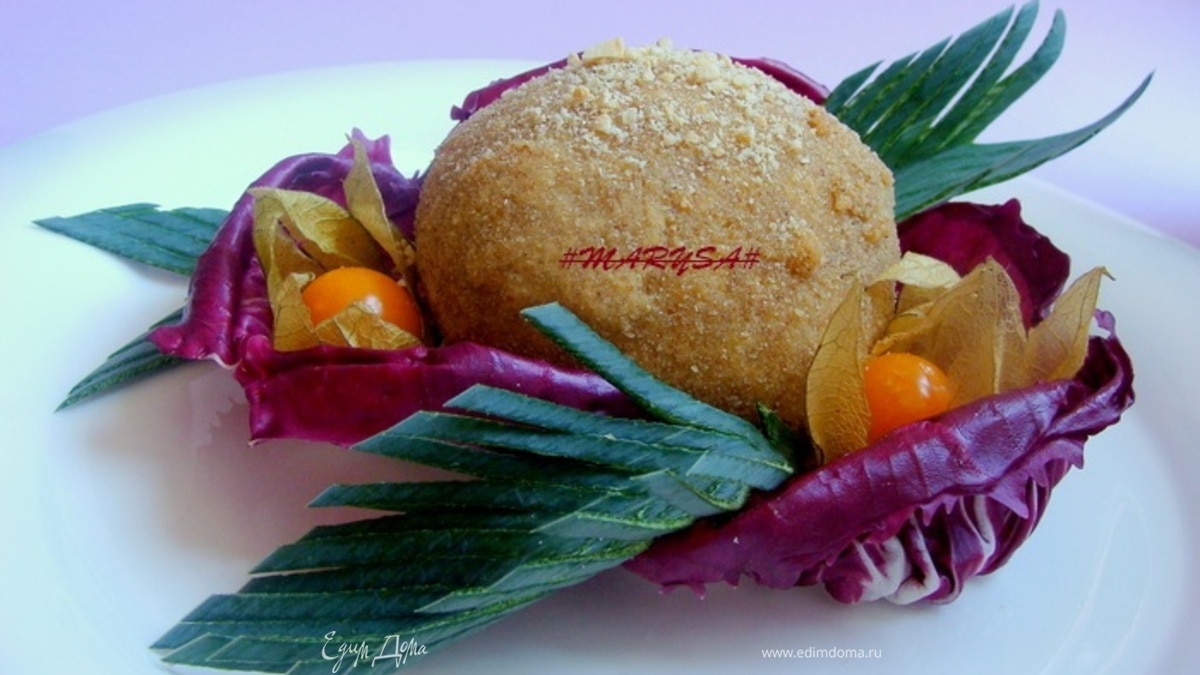Обвалять шарик сначала в муке, потом в яйце, потом в сухарях, еще раз в яйце и опять в сухарях, и еще один раз в яйце, а потом сухарях. Жарить во фритюре ровно 1 минуту! Это мой огромной шарик! Шарики меньшего размера и жарить нужно меньшее время...