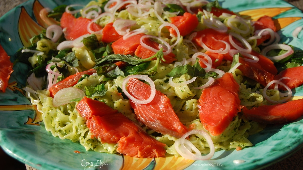 Выложить пасту на большое блюдо, сбрызнуть оливковым маслом, сверху поместить ломтики рыбы и замаринованный лук.