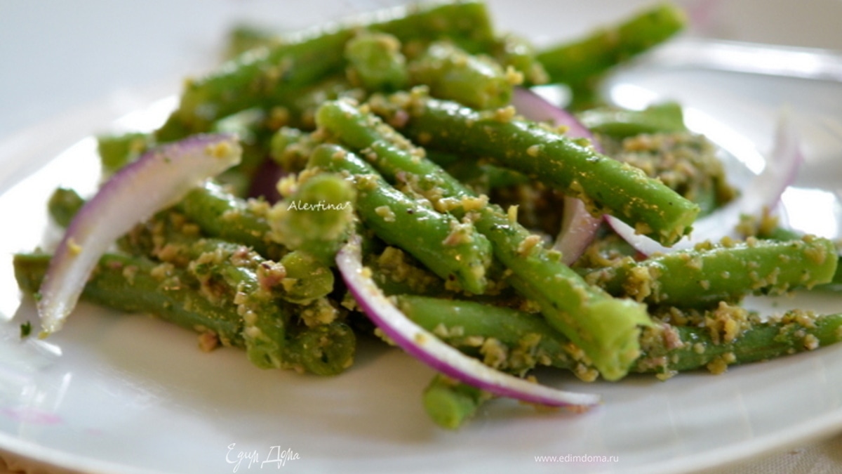 Кончики зеленой фасоли отрезать, фасоль помыть. Отварить в соленой кипящей воде примерно 6 минут. Воду слить. - Шаг 1