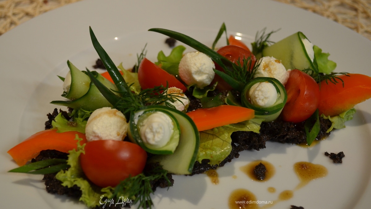 Черри разрезать на пополам, огурцы нарезать лентами по всей длине и свернуть конусом. Перец болгарский нарезать треугольничками. - Шаг 1Маслины измельчить блендером, выложить на тарелку по всей длине. А теперь представьте, что тарелка это ваша палитра, а вы художник. Рисуйте свою картину в произвольном порядке. Конусы из огурца заполните мягким сыром из кондитерского мешка (фета или альметте).