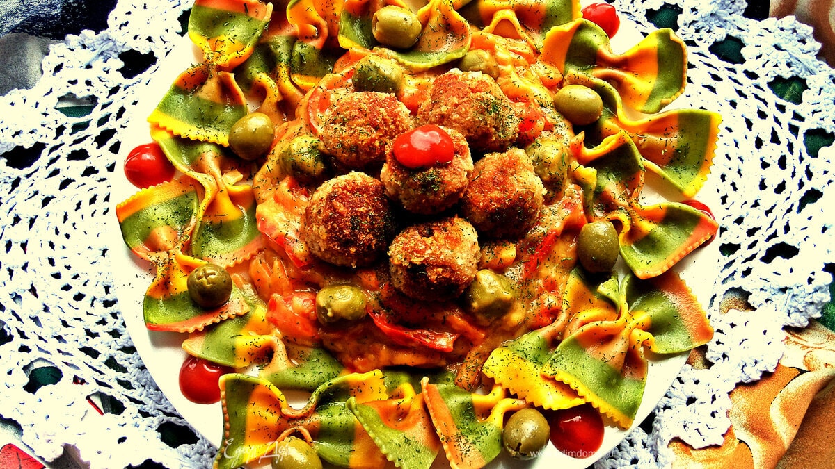 Тефтельки с трёхцветной пастой и овощной подливой