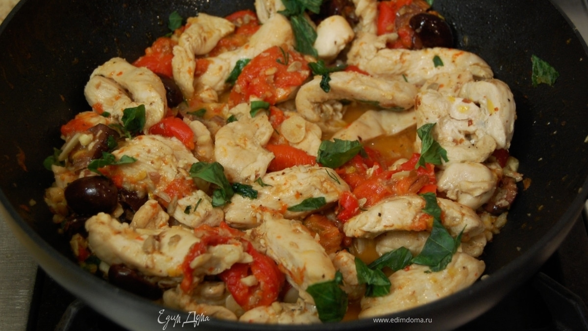 Базилик порвать руками, посыпать курицу, перемешать и обжаривать еще несколько секунд, затем выключить огонь.