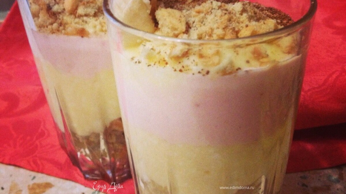 - Шаг 2Вытаскиваем нашу смесь и раскладываем по пиалочкам или мискам, я выкладывала в стаканы (на две порции). Распределяем массу по дну стакана и выкладываем см 2-3.