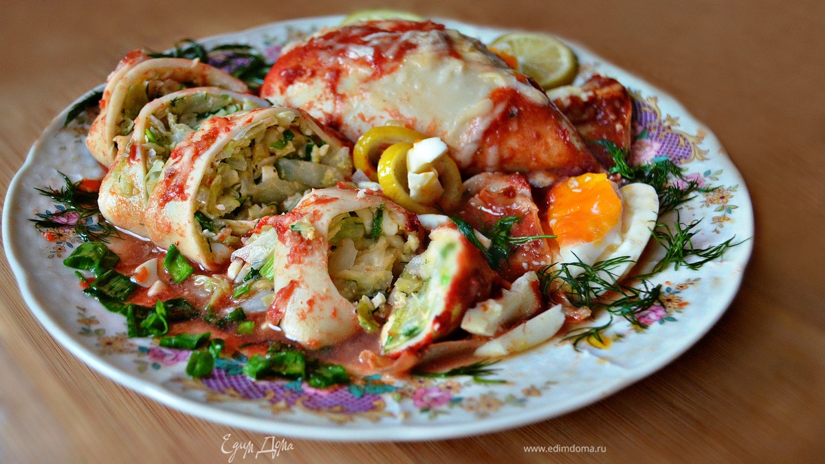 Кальмары, фаршированные капустой