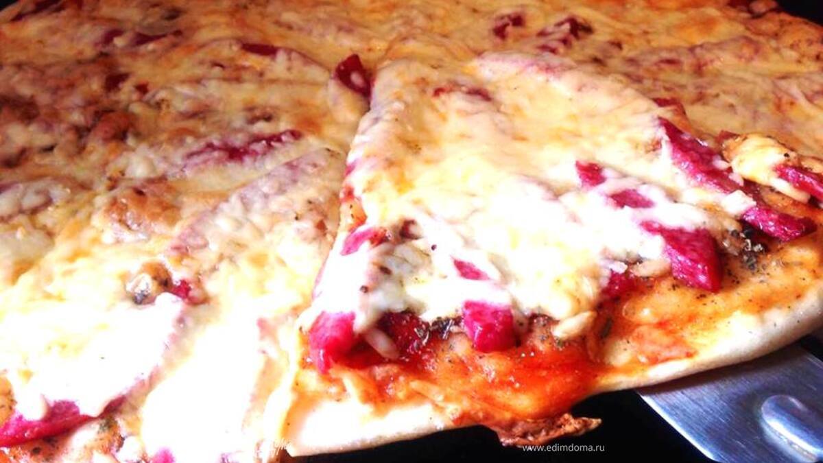Эта пицца получается тонкая как в итальянской пиццерии. Не люблю пышные пиццы как булки. Мне очень понравился этот рецепт - экспериментировать с начинками можно по-разному. На этот раз делала с колбасой салями, вместо обычного сыра брала сыр сулугуни, мне нравится, как он тянется в горячем виде. Из этого количества теста получается 2 очень большие пиццы.
