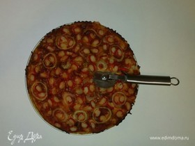 Тесто: высыпать в 500 мл слегка теплой воды 1 ст ложку сухих дрожжей и 1 ст ложку сахара, перемешать. Всыпать 1 стакан просеянной муки, перемешать, накрыть миску полотенцем и дать постоять 40 мин. После этого добавить 1 чайную ложку соли, 3 ст ложки оливкового масла и еще 2 стакана просеянной муки и все это хорошо вымешать. Накрыть полотенцем и дать тесту хорошо подняться. Когда тесто поднялось, разделить его на 2 части (можно больше, зависит от того, какого размера вы хотите делать пиццу), высыпать на доску пол стакана муки для работы с тестом...раскатать корж толщиной 0,5 см, посыпать немного противень мукой и выложить корж.