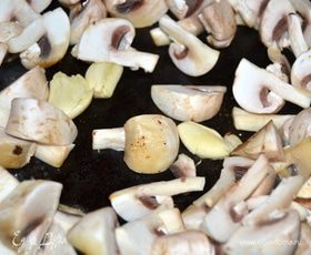 В сковороду отправьте нарезанные дольками шампиньоны и раздавленный плоской строной ножа чеснок. Обжарьте.