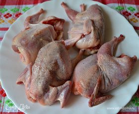 Затем тушки птичек хорошо натереть солью, перцем. Делайте это аккуратно, чтобы не повредить нежную кожицу.