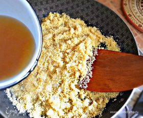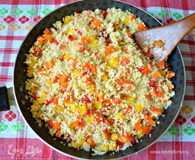 Выключить огонь, добавить кускус и перемешать. Влить горячий куриный бульон, накрыть сковороду крышкой и дать постоять 5-7 минут.