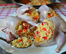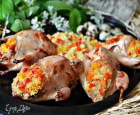 Нежное, сочное и ароматное мясо перепела обладает замечательным вкусом, относится к деликатесам, а в обиходе называется "царской птицей". Оно превосходит крольчатину и курятину по питательным, вкусовым и диетическим свойствам. Мясо перепёлок легко усвояемое и обладает весьма ценным составом. Перепела менее, чем курица, содержат холестерин и гораздо больше белка, что делает их незаменимым элементом рациона для тех, кто ведет активный образ жизни, а также для детей и людей пожилого возраста. Это мясо укрепляет иммунитет, способствует улучшению здоровья состояния кожи и костей, нормализует пищеварение. Ко всему прочему, это мясо отличается особой мягкостью и нежным вкусом, и в длительном приготовлении не нуждается. И все-таки, как вы поняли, эта маленькая и нежная птичка, требует особый ювелирный подход в её приготовлении. В своём блюде я постаралась подчеркнуть необычные нюансы вкуса путем сочетания ароматов цитрусовых и крупы кускус. Замариновать, аккуратно нафаршировать этих крохотных птичек - это только начальный этап ювелирного процесса!! Очень важно в приготовлении перепёлок - не пересушить во время запекания их нежное мясо! Поэтому аккуратно и чётко соблюдая все советы по приготовлению, вы добьётесь превосходного результата - у вас на столе будет не просто праздничное, но и изысканное блюдо! Приступим, друзья!