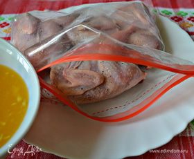 Их необходимо уложить в пакет, налить приготовленный фреш и герметично закрыть пакет-слайдер (со специальным замком-зажимом). Если такого пакета у вас нет, то можно положить перепёлок в обычный пакет и, выпустив лишний воздух, плотно закрыть. Положить пакет на 30 минут в холодильник.