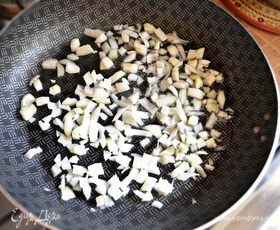 Тем временем приготовить начинку. Мелко порезать 1 маленькую луковицу и пассировать на растительном масле до прозрачности.