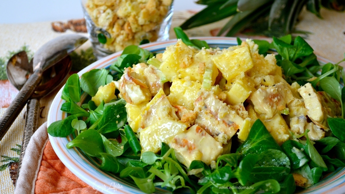 23Я делала зимой такой салат с" Магги на второе. Куриная грудка в листах ", по-моему был какой-то конкурс, где обязательно должно было быть "Магги". 😉 И ананасы там использовались консервированные, да и посыпки крошкой в том рецепте у меня не было. Думаю, что ваш вариант салата должен быть ещё лучше. 😃
