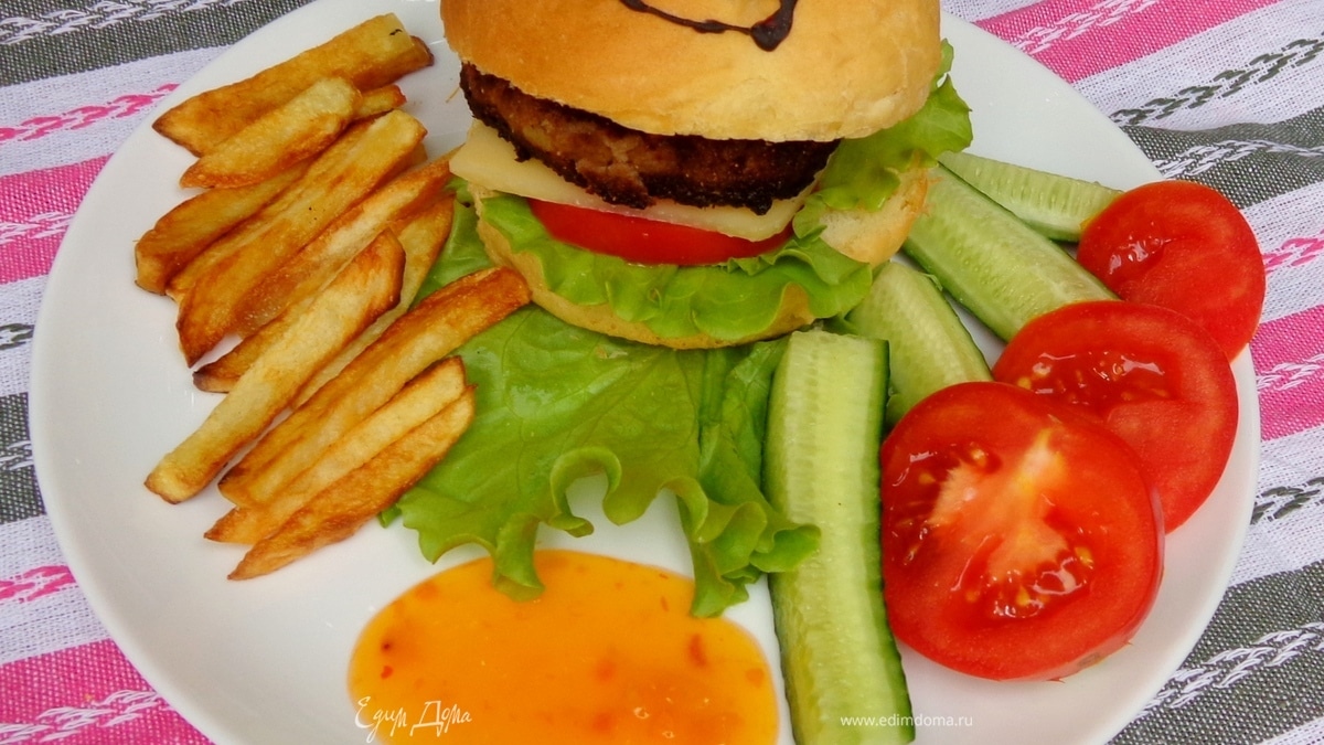 А теперь делаем гамбургер как обычно - с салатом, помидором, сыром и котлеткой. Приятного аппетита!