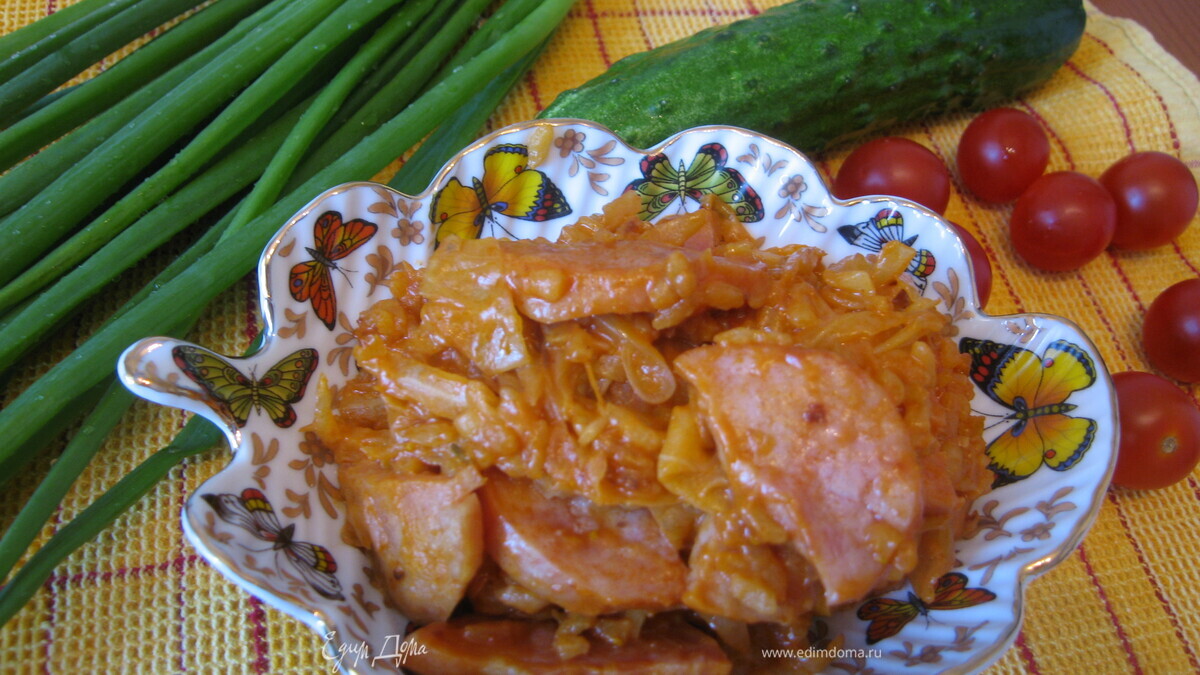Добавить нарезанные колбаски, сметану и тушить до готовности.