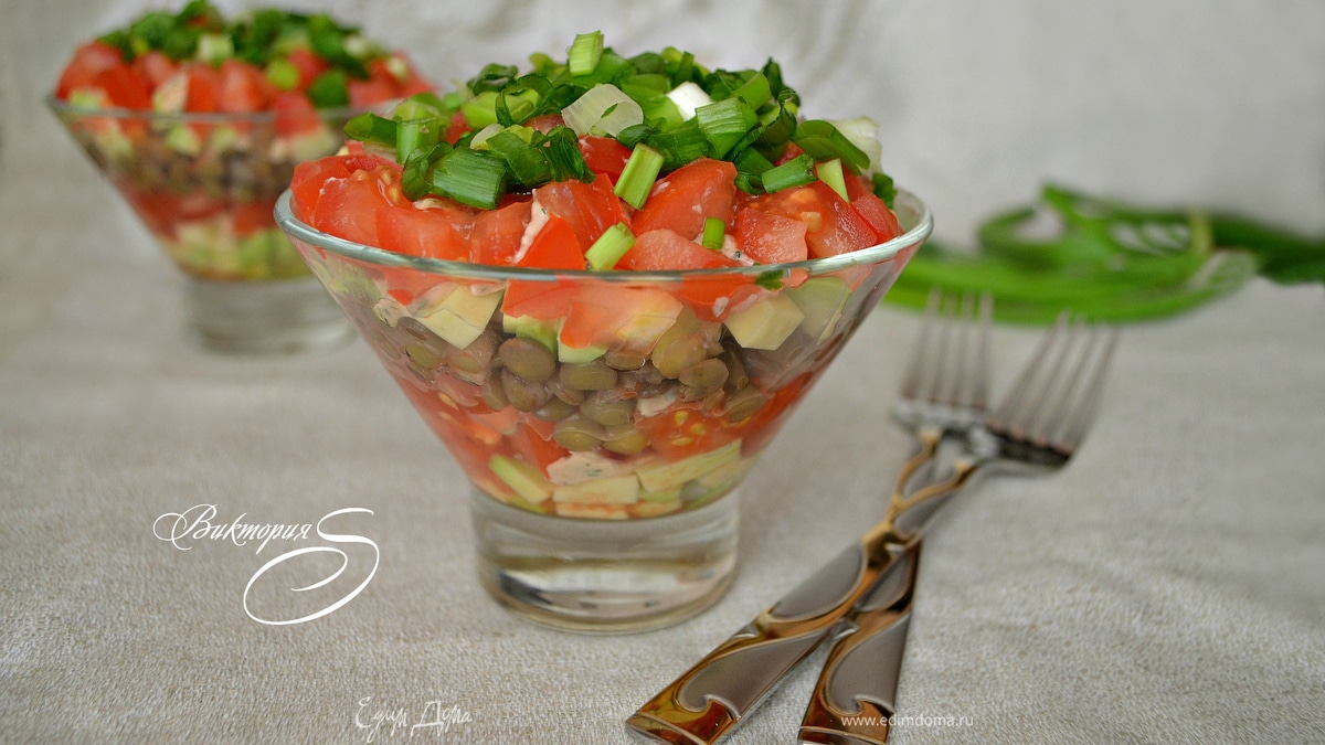 В салатник положить в произвольном порядке нарезанные томаты, авокадо, чечевицу, каждый слой промазывая соусом. Соус получается достаточно густым. Для более жидкой консистенции - можно немного уменьшить количество форели и увеличить количество йогурта. - Шаг 7