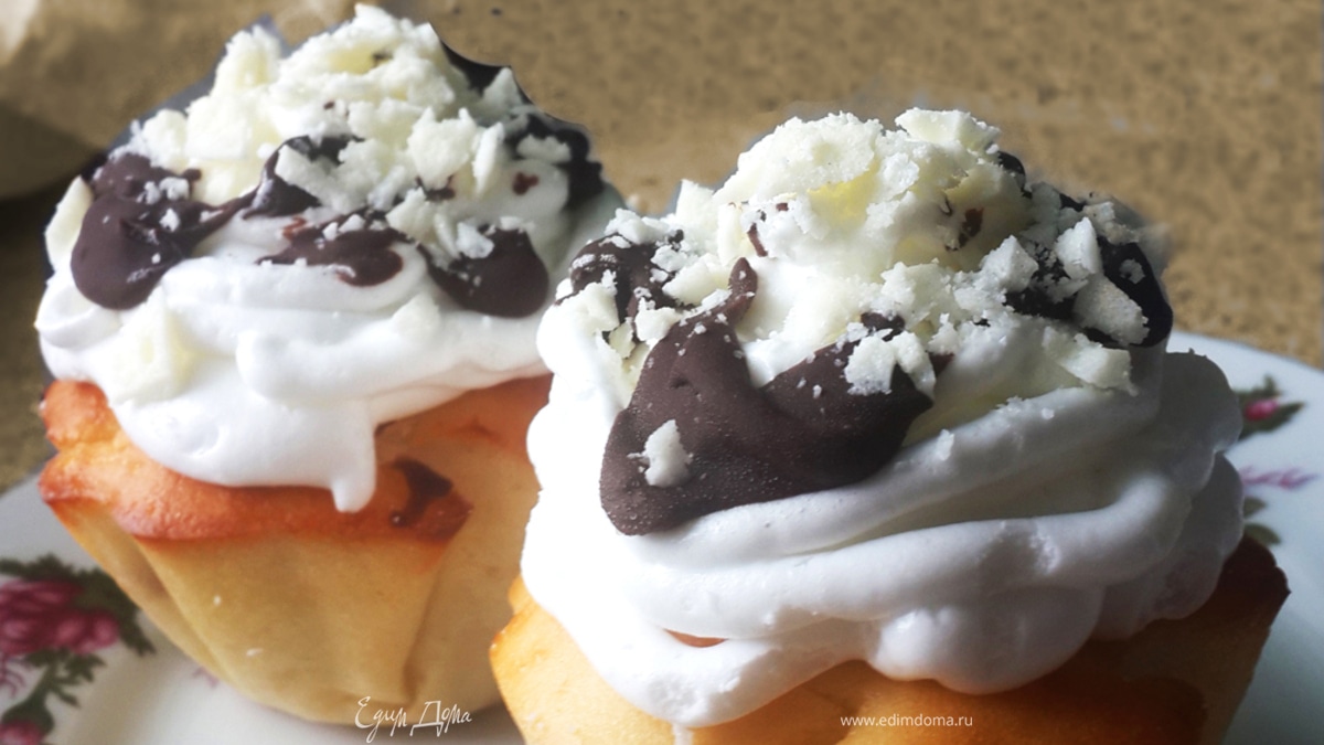 Изюминка маффинов - топпинг из взбитых сливок. Я использую сухую смесь для сливок, в которую нужно просто добавить молоко. Растапливаю темный шоколад с молоком и сливочным маслом до консистенции сметаны. Украшаю остывшие (!) маффины сливками, поливаю темным шоколадом и присыпаю струганным белым. Белый шоколад очень приятно похрустывает. P.S. Еле дописала, так как безумно хотелось приготовить и отведать этот десерт еще раз =)