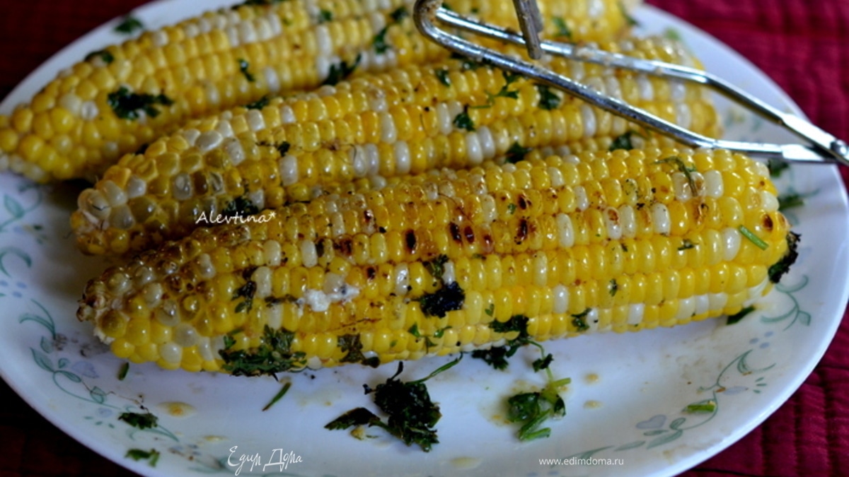 Смазать кукурузу со всех сторон. Готовим на разогретом гриле 10-20 мин под закрытой крышкой. Готовить можно и в фольге, закрыв кукурузу.