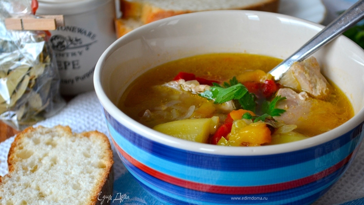 Через 30 минут выложить в кастрюлю кусочки тунца, нарезанный полосочками перец и готовить всё ещё 5 минут. Готовый суп снять с огня и дать постоять минут 20.
