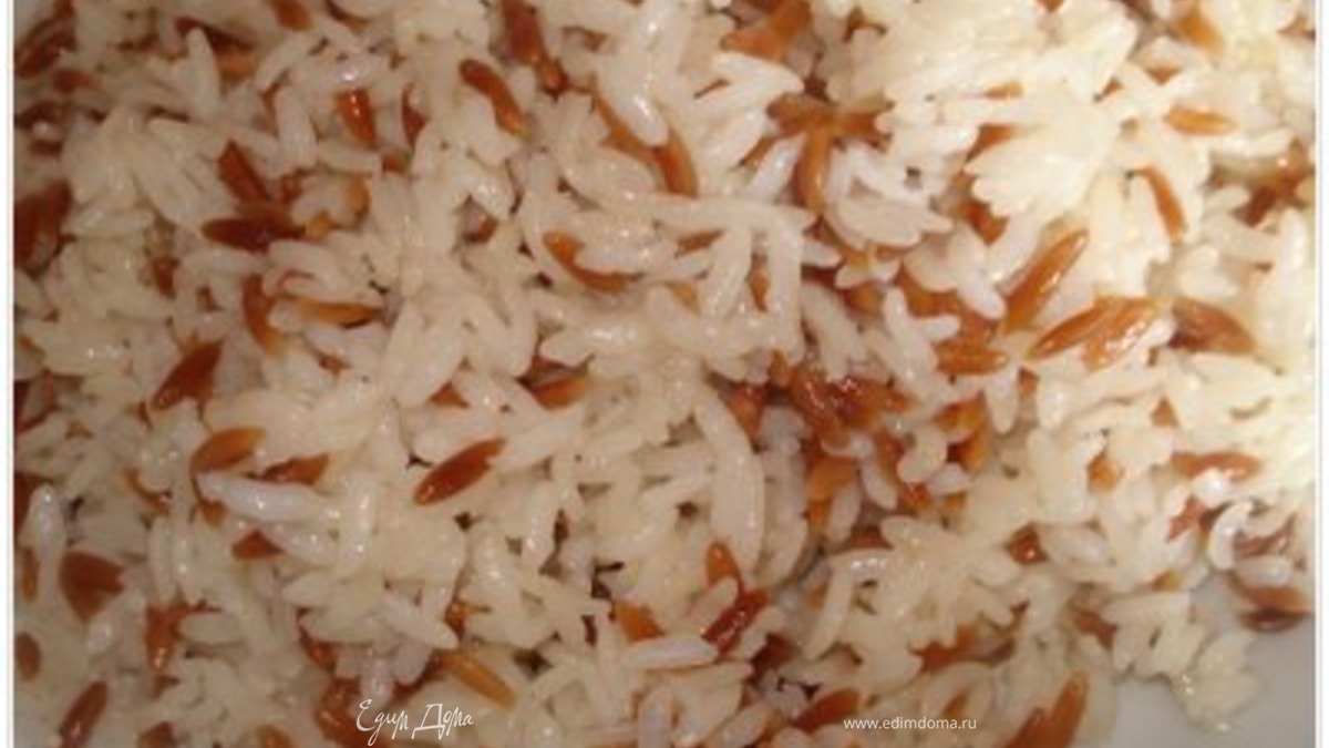 - Шаг 3** Как вариант: для разбавления белого цвета риса можно добавить тонкую вермишель (пару больших жменей, либо мелких турецких макарон из твердых сортов пшеницы – шехрие (Şehriye). Все это нужно добавлять сразу в горячую сухую сковороду перед добавлением масла и обжарить минуты 2-3 до розового цвета. Как только заметите, что макарончики начали темнеть, сразу кладите сливочное масло и продолжайте процесс приготовления по указанному рецепту. На фото показан вариант плова с шехрие (Şehriye).