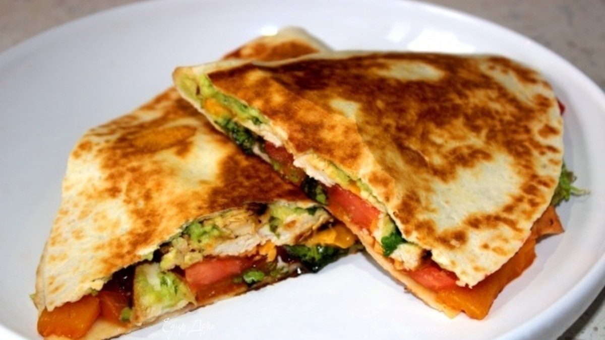 Собираем кесадилью. На половину тортильи укладываем по порядку: гуакамоле, куриные грудки, сыр чеддер, помидоры с кинзой, полоски печеного перца. - Шаг 7