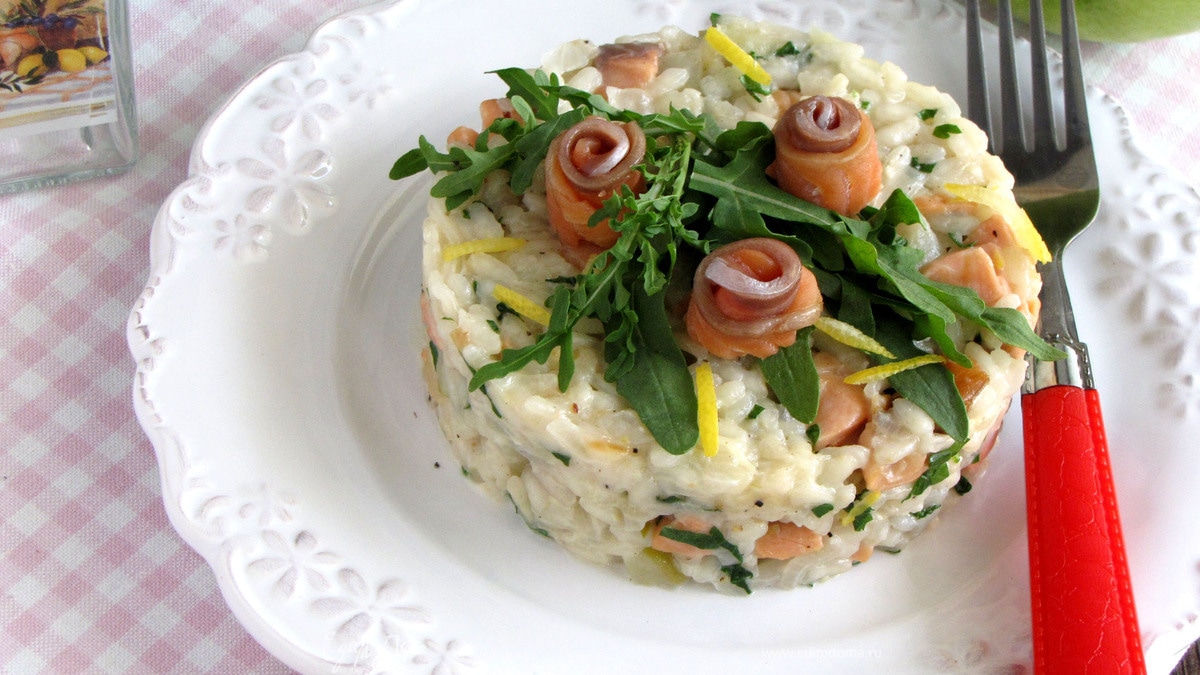 Разложить ризотто по тарелкам, украсить руколой и оставшимися ломтиками лосося. Сбрызнуть лимонным соком и сразу же подавать. Это очень, очень вкусно! Приятного аппетита!