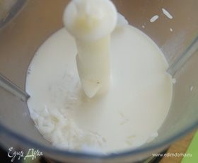 Замочить желатин в небольшом количестве холодной воды. В чашу блендера выложить рис, залить молоком, добавить сахар и соль. Взбить в течении 5 минут.