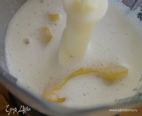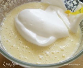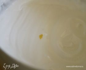 Приготовить итальянскую меренгу. Из сахара и воды сварить сироп температурой 120 градусов, если нет термометра, то можно определить готовность сиропа по крупным пузырям на поверхности.