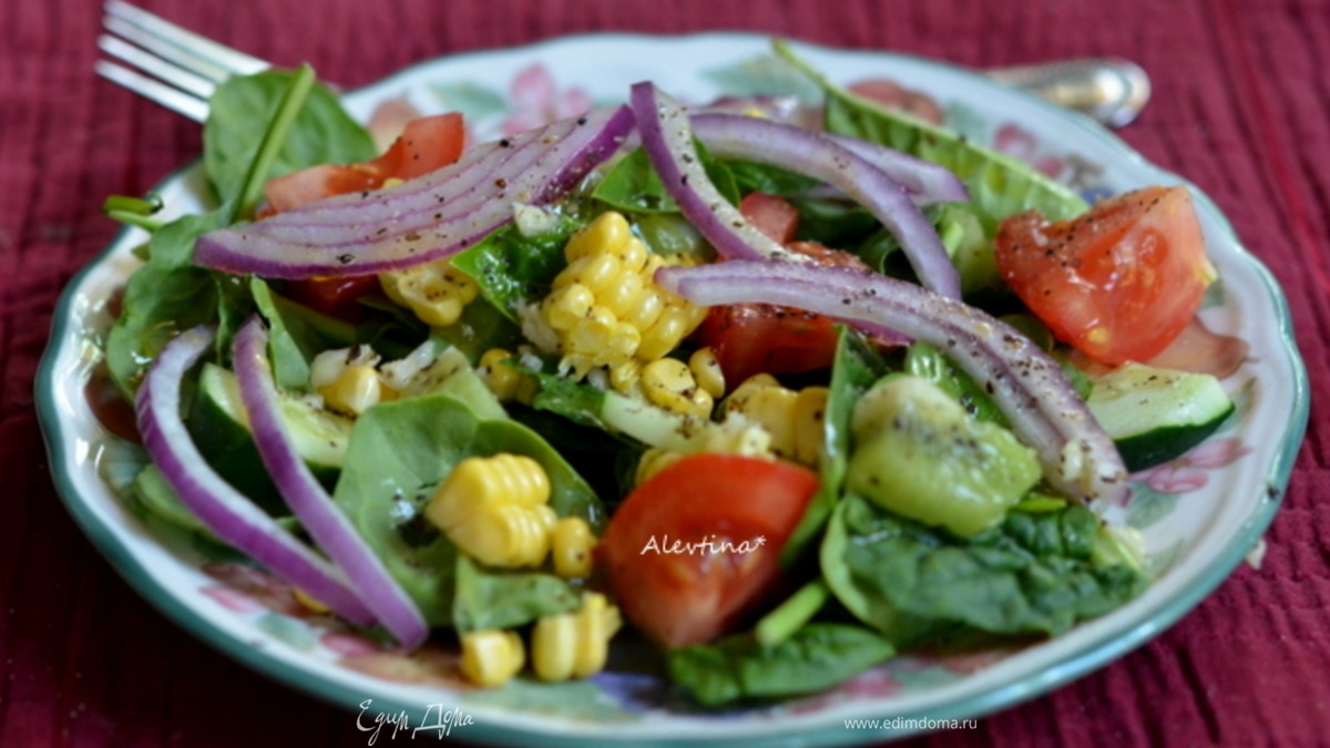 Разложим по тарелкам молодой помытый шпинат, либо можно заменить на салатный микс, такой как смесь руколы, шпината, молодых листьев салата. Помидор крупный разрезаем на несколько частей, кукурузу свежую очищаем от початка и срезаем острым ножом аккуратно желтые зерна, базилик листья свежие раскладываем по тарелкам, огурец тонко нарезаем, лук красный, киви или манго очищаем и на кубики.