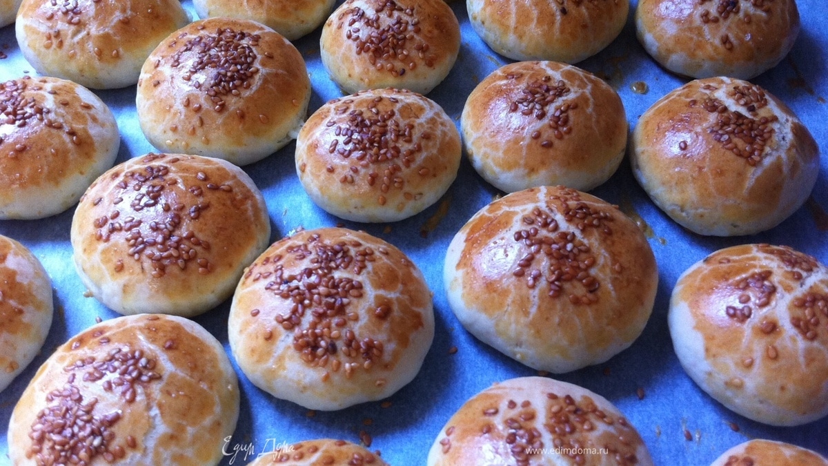 Наши заготовки выложить на противень, застеленный пекарской бумагой. Имейте ввиду, что в духовке булочки увеличатся в размере, поэтому плотно не укладывайте. Из этой пропорции обычно получается 1,5 больших противня для выпечки (для стандартной духовки шириной 60 см). Приготовим смесь для смазки. В маленькой миске или стакане взбить вилкой 2 желтка с 1 ст. л. масла (лучше оливкового). Смазать этой смесью булочки. Сверху посыпать кунжутом, черным тмином (он хорошо сочетается с мясной начинкой) или маком. Также можно оставить без обсыпки - они и так будут вкусными и красивыми. ** Если выпекать булочки, предварительно замороженные, то их также нужно выложить на противень, поставить в духовку при 150 градусах минут на 10. Затем вытащить противень, смазать и обсыпать как указано выше и вернуть в духовку уже на 180 градусов до готовности. Не смазывайте яйцом холодное тесто, так как оно частично впитается и блеска не будет. Также замороженную поачу лучше вынуть из морозилки и переложить в холодильную камеру на ночь для медленной разморозки, а утром печь как обычно.