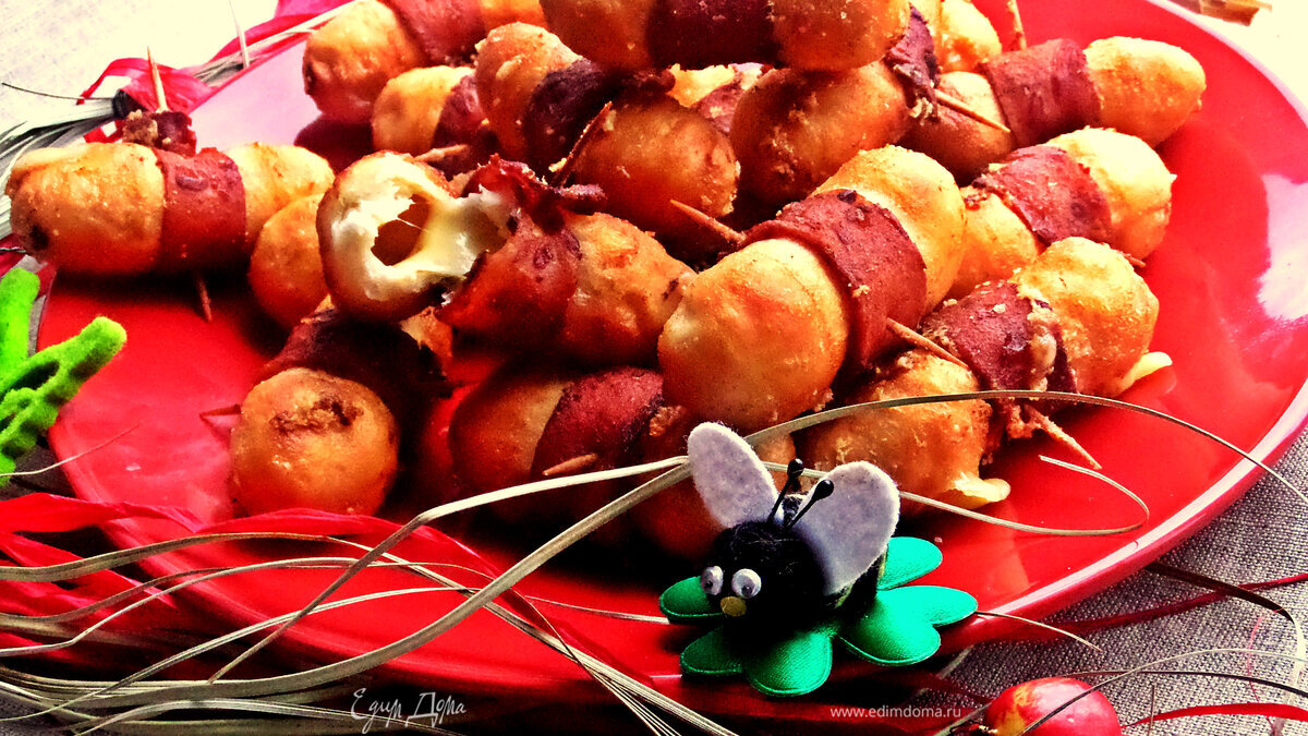 Бекон или ветчину нарезать на полоски и обернуть каждый пирожок, скрепить зубочистками. - Шаг 9