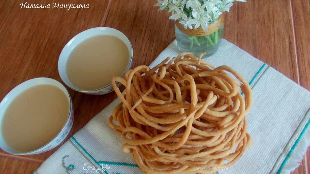 Ювелирность здесь во всем, в приготовлении теста, раскатывании его и растягивании, в жарке на палочках, да и в самом внешнем виде!. Скажу честно пришлось повозиться, масляное тесто намного сложнее тянется, чем на лапшу, а если рвется, то уже не скрепляется!. Хотя, везде нужен опыт, после второй санзы, у меня уже дело пошло легче, а на последней, четвертой, вообще замечательно получилось, намного быстрее сделала.