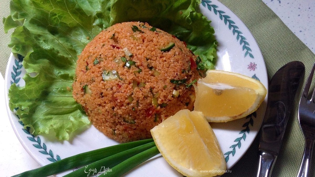 Это турецкий национальный салат из запаренного кипятком булгура и обычных сырых овощей. Подается как обычная холодная закуска - перед основным блюдом.