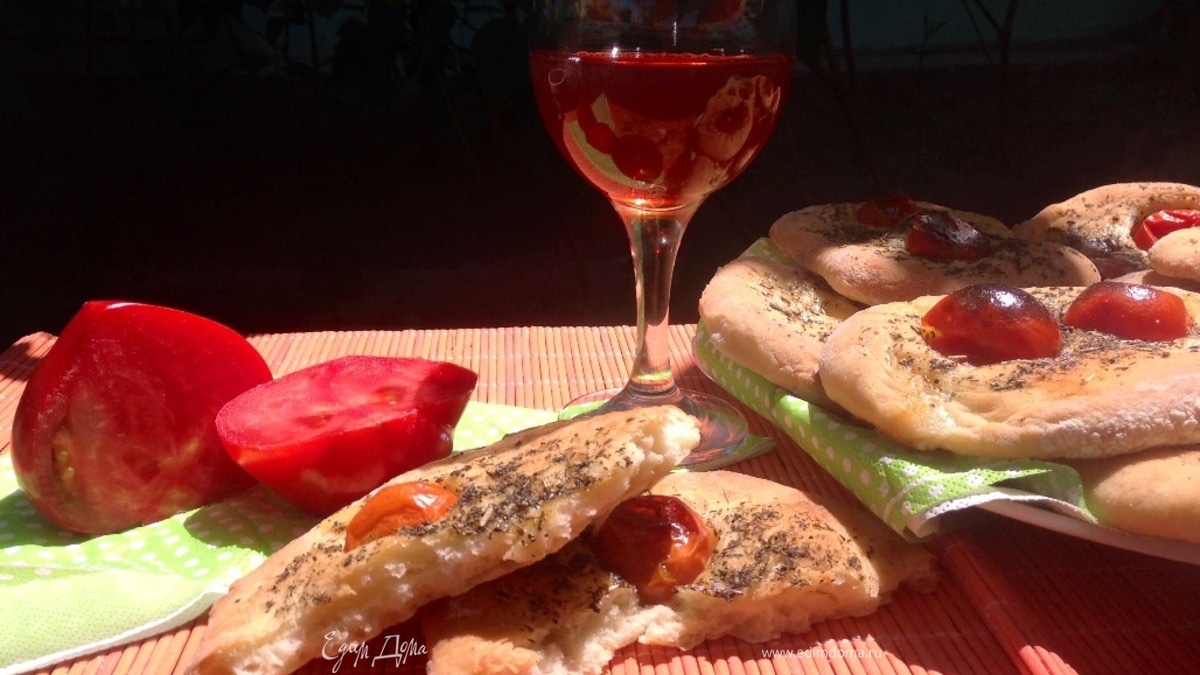 Выкатываем лепешки небольшого размера, поливаем их чуть оливковым маслом, посыпаем итальянскими травами, один помидор черри режем пополам (желательно брать сладкие черри) и слегка вдавливаем половинки черри в лепешку.